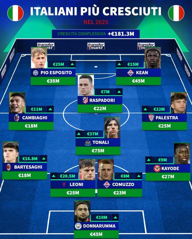 12月26日,德转列出了2025年身价上涨的意大利球员最佳11人阵容,近一年身价上涨3700万欧元的托纳利领衔,多纳鲁马、皮奥-埃斯波西托、巴尔泰萨吉以及莱昂尼在列。